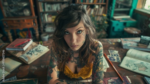 Photo of a tattooed young woman sitting at a desk in an office and studying.