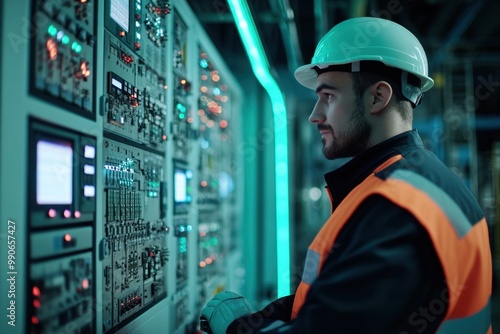 Photo of a technician wearing a safety vest and hat focusing on looking at a cable panel and analyzing damage. looking for problems and fixing damage