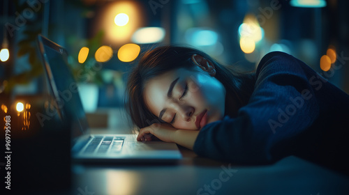 Photo of a tired business woman sleeping on her desk with a laptop, in a night office background,
