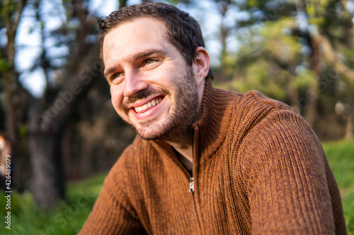 Photo of a young and attractive man sitting in the park during a sunny day and smiling