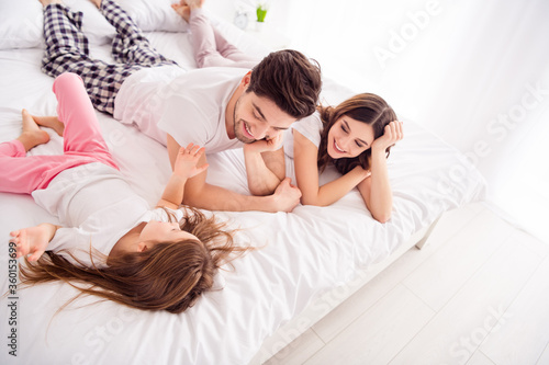 Photo of amazing young family lady guy little girl mommy daddy daughter lying sheets having fun good mood spend time together chatting quarantine weekend self isolation bedroom indoors