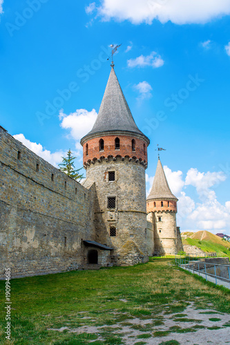 Photo of ancient stone castle with many hight towers in Kamyanets-Podilsky