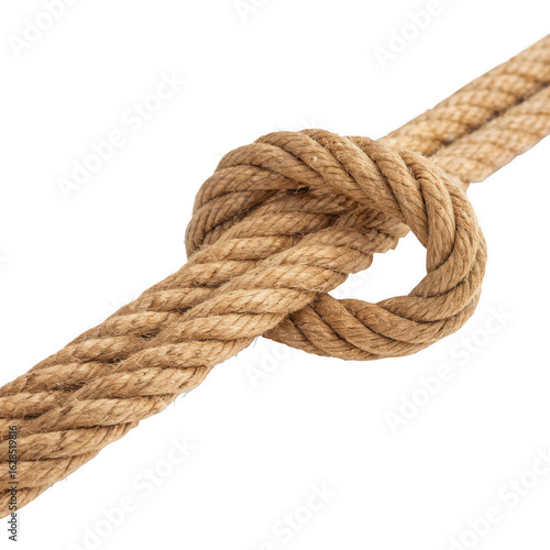 Photo of closeup of a thick brown rope tied in a knot, isolated on transparent background