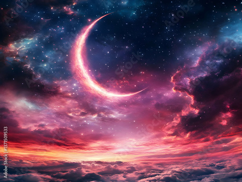 crescent, sky, night, star, cloud, space, cosmic, fantasy, dreamy, glowing, red, purple, blue, dark, celestial, moon, aethereal, abstract, background, art, illustration, digital, creative, vibrant, atmospheric, nebula, galaxy, twinkling, shining, illuminated, fantastic, surreal, magical, mystical, wonder, beauty, scenic, spectacular, tranquil, peaceful, energy, light, colours, texture, composition, horizon, landscape, panoramic, wallpaper