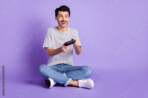 Photo of guy hold controller open mouth look empty space wear t-shirt jeans footwear isolated purple background