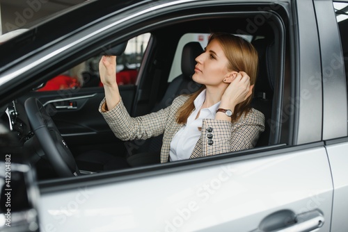 Photo of happy young woman sitting inside her new car. Concept for car rental