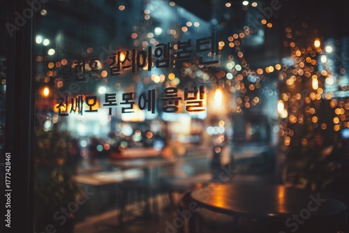 photo of Korean café with reflections of city lights in glass, moody aesthetic and bokeh