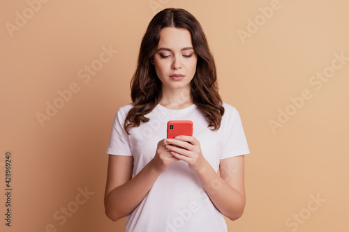 Photo of pensive woman hold telephone look screen read sms posing on beige background