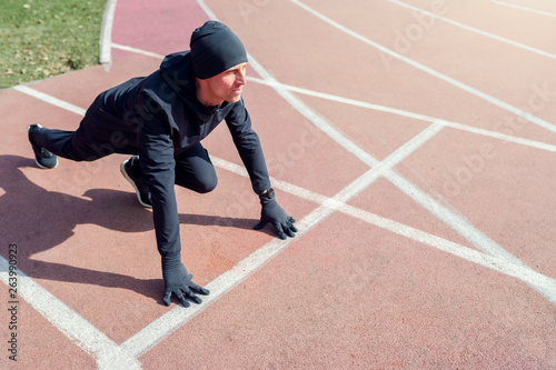 man, runner, start, spring, stadium, getting ready, black, clothes, activewear, young, day, hat, athlete, sport, track, brown, grass, sportsman, race track, champion, activity, competitive, jogger, sporty, photogenic, physical exercise, sprinter, motion, park, standing, healthy, field, speed, fit, recreation, male, muscle, run, active, game, sport, adult, 1, professional, training, lifestyle, determination