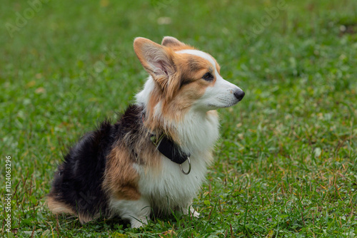 Photo of Welsh Corgi Dog Playing in Park on Green Grass. Pembroke Corgi Puppy Having Fun Outdoors
