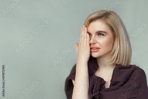 Photo of young blonde woman with a haircut, a woman with a positive smile close her eyes with her hand, check her eyesight, ophthalmology isolated on a beige color background