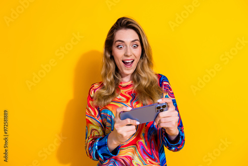 Photo portrait of lovely young lady excited play mobile game dressed stylish colorful garment isolated on yellow color background