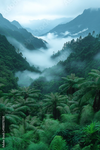 Photo réaliste d’une jungle tropicale brumeuse avec une atmosphère éthérée