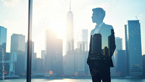 Photo realistic double exposure of a silhouette person and smart city skyline symbolizing urban innovation, with ample copy space for text in photo stock concept.