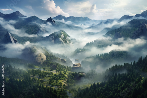 Photo realistic illustration of mountains forest fog morning mystic.