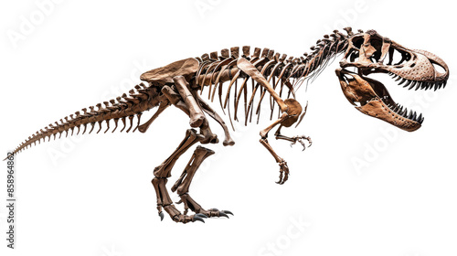 photograph of a skeleton of a Tyrannosaurus Rex, assembled in a museum, against a transparent background
