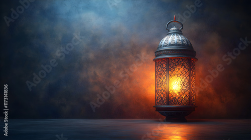 Photograph of Silver Lantern Emitting Warm Orange Glow Against Smoky Dark Blue Background Casting Reflective Light on Dark Surface