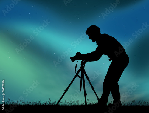 photo, aurora borealis, sky, blue, silhouette, illustration, man, camera, green, magnetic, astronomy, atmosphere, celestial, light, phenomena, northern, ionosphere, nature, polar