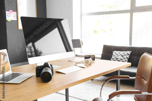 Photographer workplace with computer, laptop and photo camera in modern studio