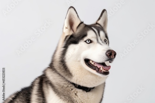 Photography in the style of pensive portraiture of a smiling siberian husky wearing a training vest against a pearl white background. With generative AI technology
