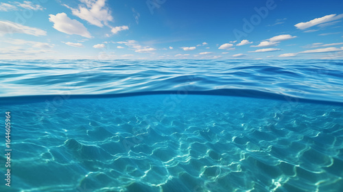 Photorealistic ocean horizon background, clear blue sky, soft waves, tropical vibe, natural sunlight