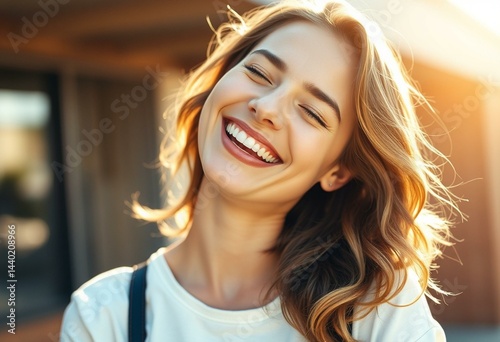 hair, natural, minimal, digital, aesthetic, sharpened, light, artifact, space, clothing, warm, gentle, copy, human, clear, private, comfortable, woman, closed, sunlight, sharp, style, photorealistic, eye, professional, wave, portrait, joke, young, laughing, noise, face, smile, carefree, bright, joy, tilted, people, casual attire, effortless