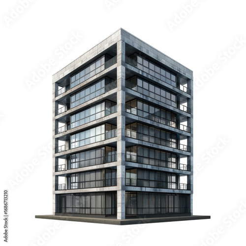 photorealistic, urban, loft, style, residential, isolated, cut-out, block, building, architecture, modern, contemporary, exterior, concrete, glasses, window, balcony, apartment, home, house, living, city, downtown, structure, geometric, symmetric, clean, sophisticated, development, property, investment, render, construction, design, facades, shadow, minimalist, straight, square, tall, high, new