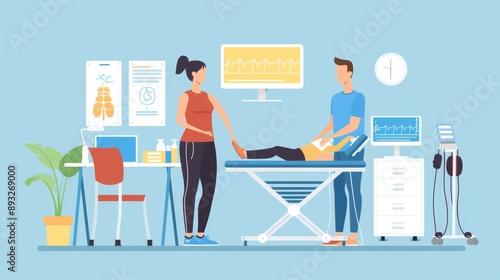 therapy, healer, physical therapist, physical, rehabilitation, treatment, doctor, health, patient, woman, man, medicals, exam, stretcher, clinic, hospital, health care, equipment, medical equipment, chart, computer, monitor, office, room, illustration, graphic, design, flat, style, cartoon, blue, white, yellow, orange, green, red