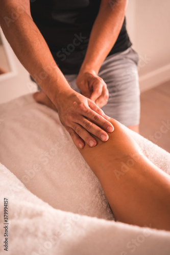 Physiotherapist's massage on the back of the left leg of a young woman lying on the table. Physio, osteopathy, relaxing massage, motion video of treatment on the back