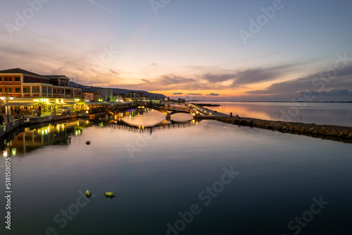 piccola città che si affaccia su una laguna al tramonto con cielo e nuvole in grecia