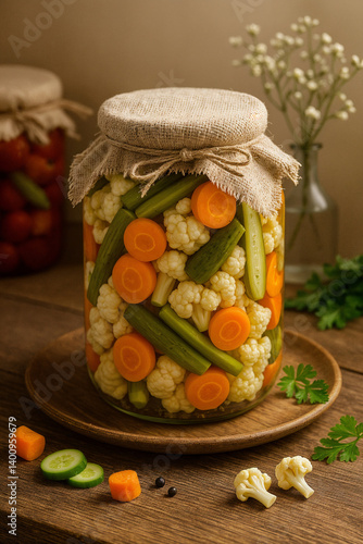 cauliflower, carrot, cucumber, pickle, vegetable, jar, preserved, canning, fermenting, brine, homemade, fermentation, rustic, food, glasses, organic, kitchen, snack, salad, crunchy, fresh, garden, sliced, preparation, cooking, preserving, spice, vinegar, seasoning, salt, herb, detail, background, storage, nourishment, fermented, healthy, household, composition, closeup, decor, parsley, natural, traditional, meal, harvest