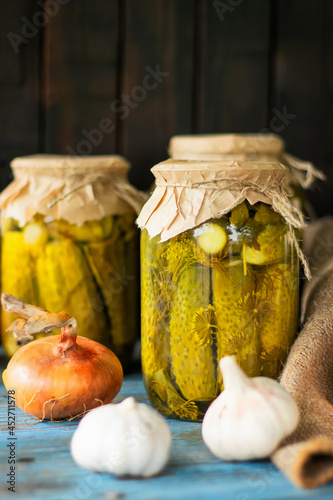 Pickled cucumbers in glass jars on an old wooden table. Summer harvest.