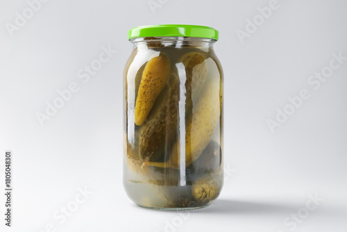 Pickled cucumbers in jar on light background, closeup