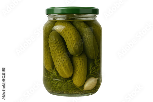 Pickled gherkins in glass jar with dill and garlic, preserving cucumbers for long-term food storage, transparent background
