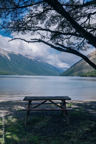 Picnic table, mountains and lake at Nelson Lakes, Tasman, New Zealand.