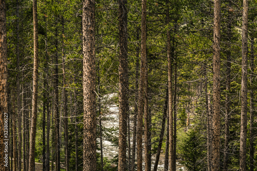 Picture of conifers in the mountains with river in background. Greenough Lake, Montana, USA