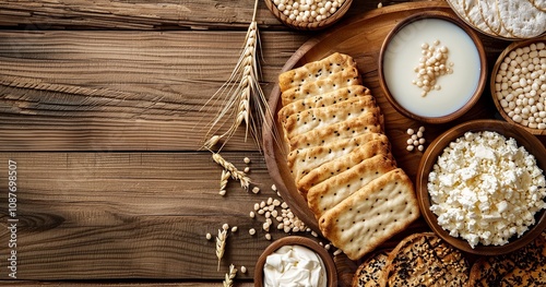 picture of dairy items set on a wooden backdrop. Signs of the Jewish holiday, Generative Ai.