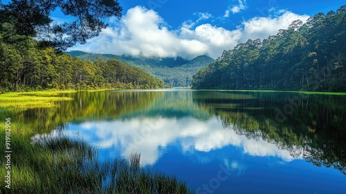 Picturesque lake surrounded by dense forest and reflections of the sky and trees