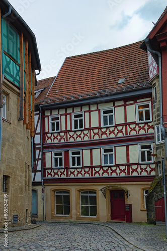 Picturesque landscape view of street with ancient houses under red tile in the old town of Kronach. Typical architecture in Bavaria, region Upper Franconia, Germany. Travel and tourism concept