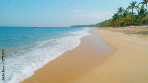picturesque tropical beach with powdery white sand, gentle waves, and palm trees lining shore creates serene and inviting atmosphere for relaxation and enjoyment