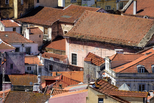 picturesque view from above of the houses and roofs in the winding, ancient streets of alfama in lisbon