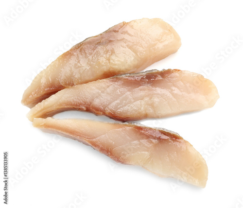 Pieces of delicious herring isolated on white, top view