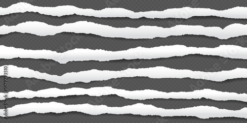 Pieces of horizontal white paper with torn, ripped edges are on black background for text or ad.