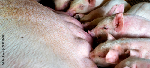 PIG FARMLittle pig is sucking milk. The newborn pig is sucking milk from the mother