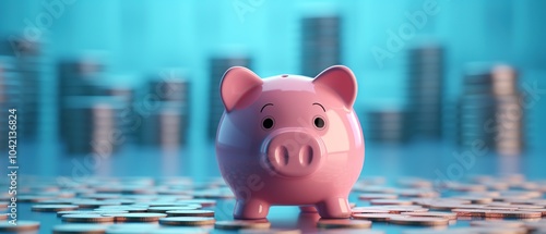 piggy bank on stacks of coins. Pink toy with money. Financial stability