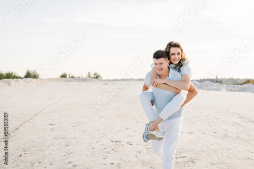 Piggybacking. A handsome young man giving a piggyback ride to a woman in summer sunset. Girl sits on back and hugs boyfriend on the sand on sandy beach. Lovely couple having fun. Time spent together.