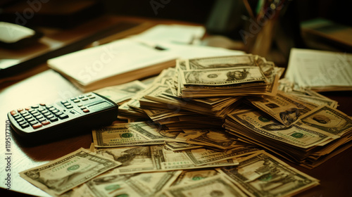 pile of cash with calculator and financial documents on desk