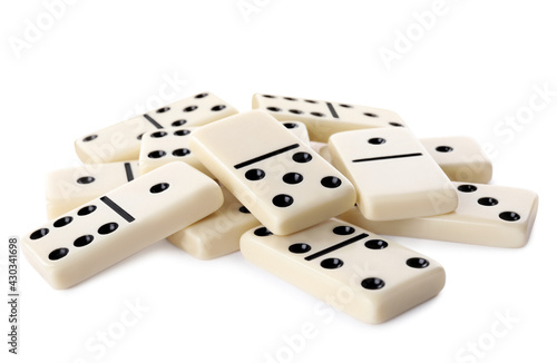 Pile of classic domino tiles on white background