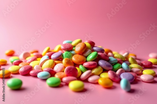 Pile of colorful candies on pink surface