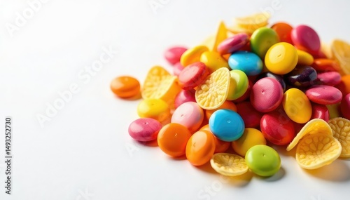 Pile of colorful candy, chips, and soda on white , delicious, candy